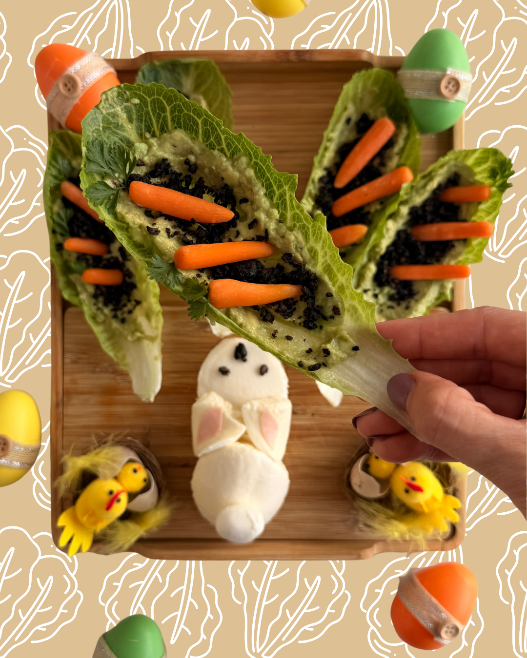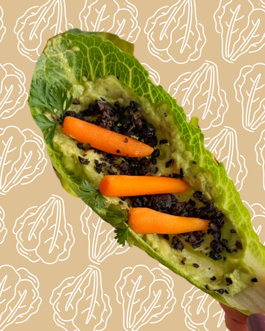 Coloca 2–3 zanahorias baby sobre el aguacate.