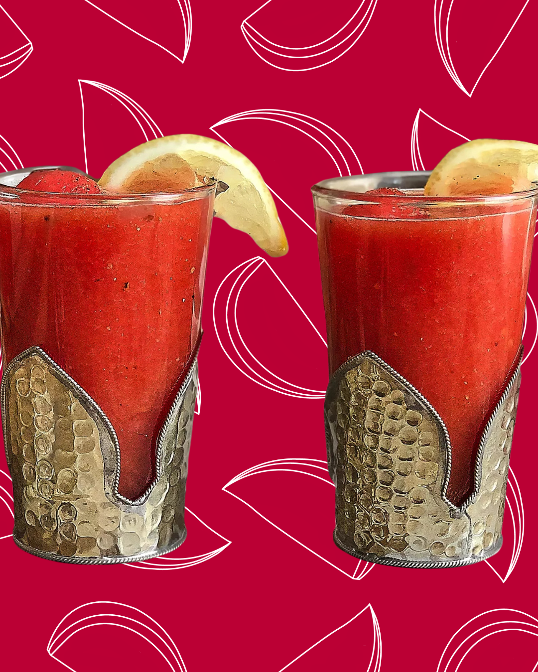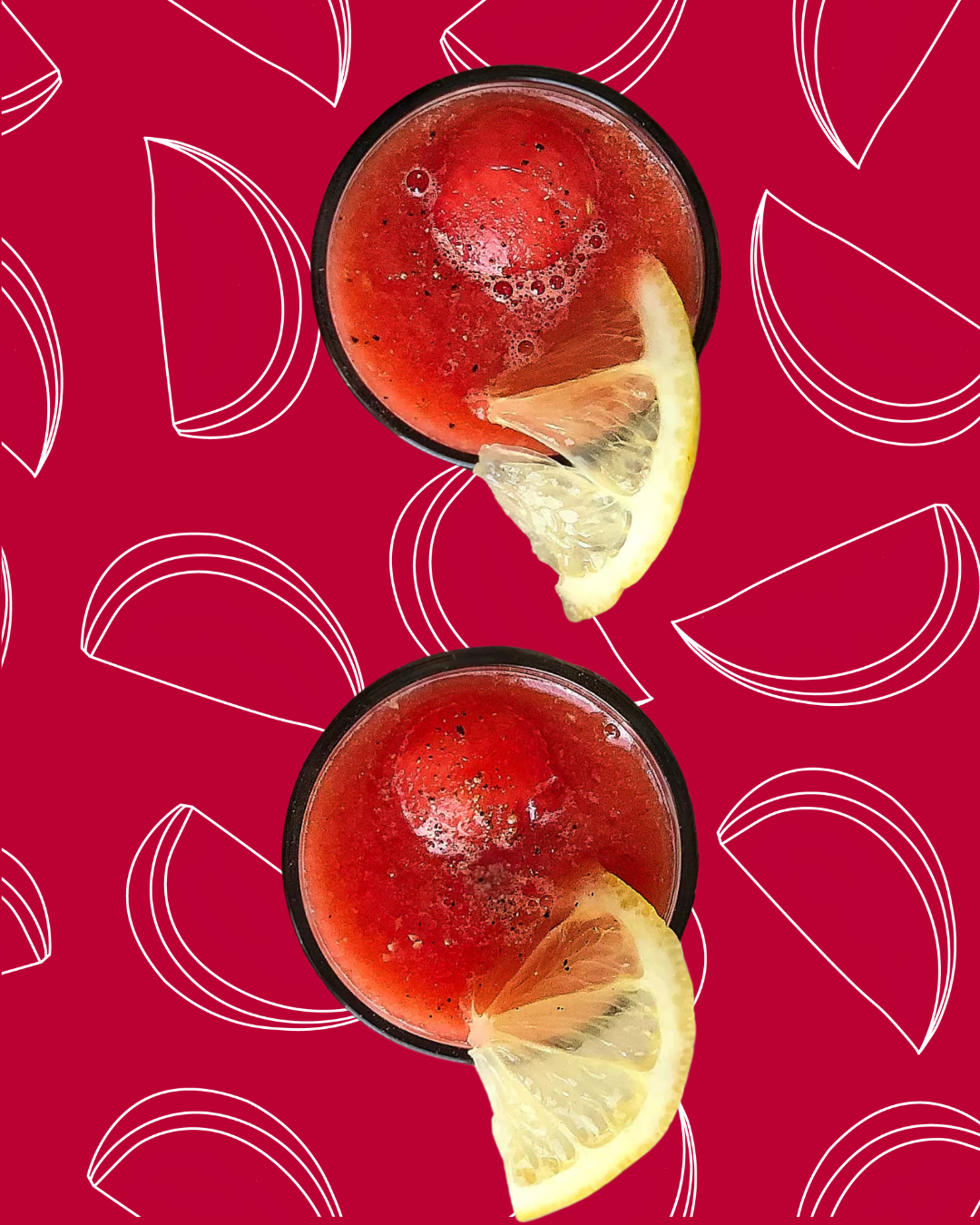 - Servimos en unos vasitos, añadimos cubitos de hielo de sandía (previamente habremos metido bolitas de sandía en el congelador para usar a modo de cubitos), una rodaja de limón y más pimienta por la superficie.