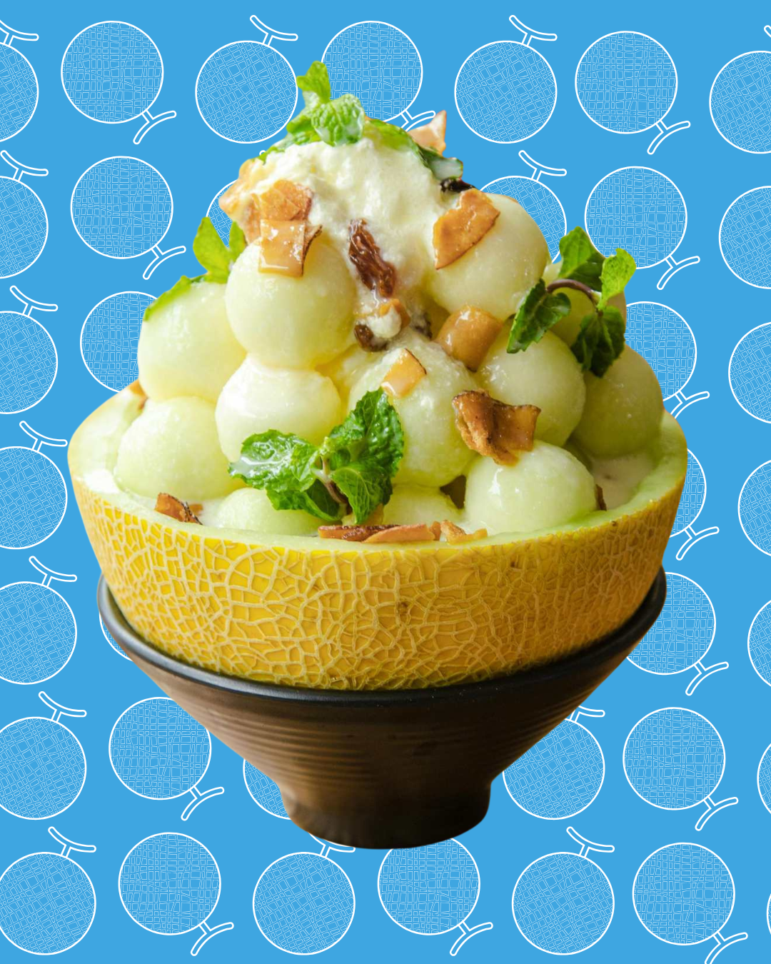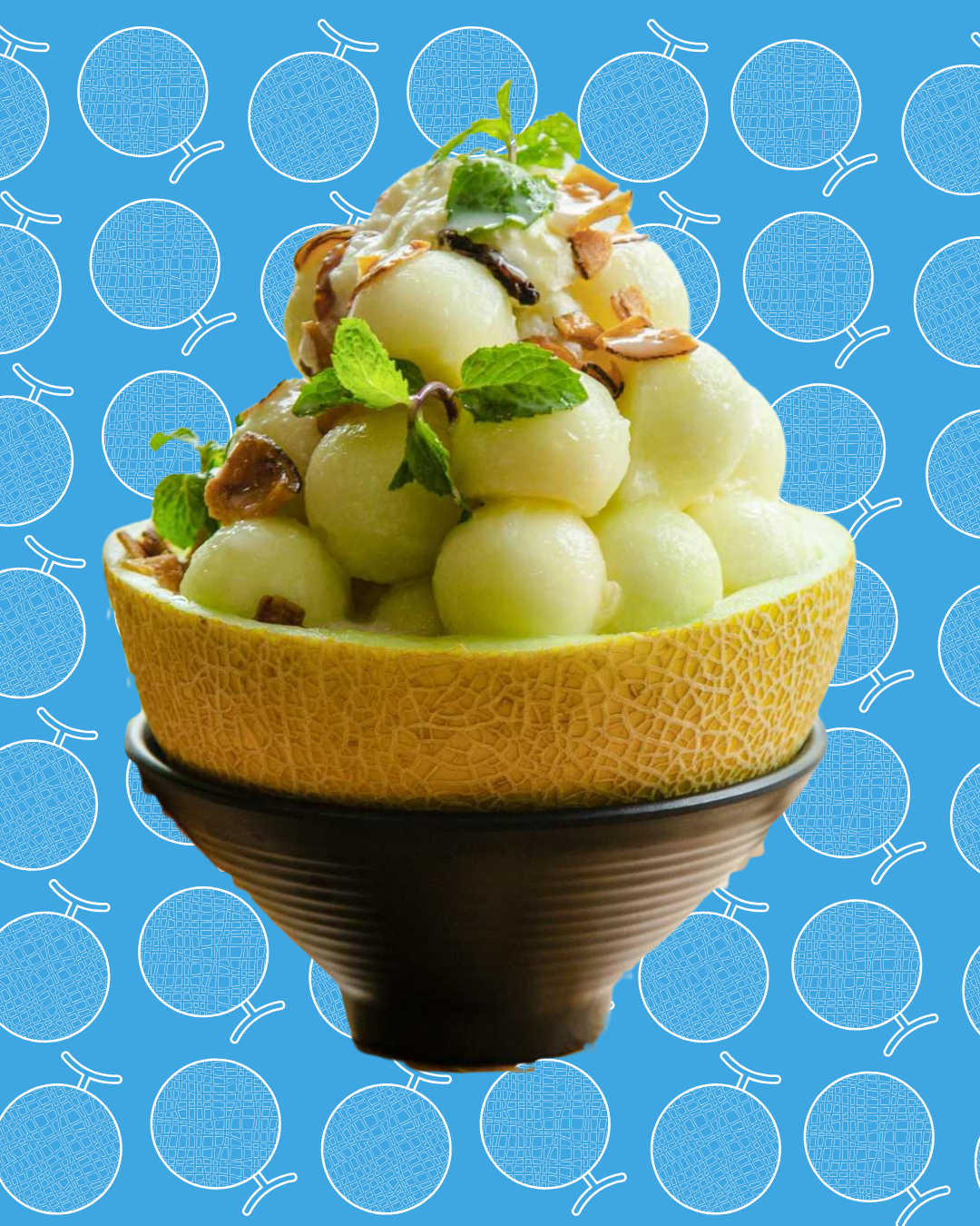 Bowl de melón Lililup con helado de coco, coco tostado y hierbabuena
