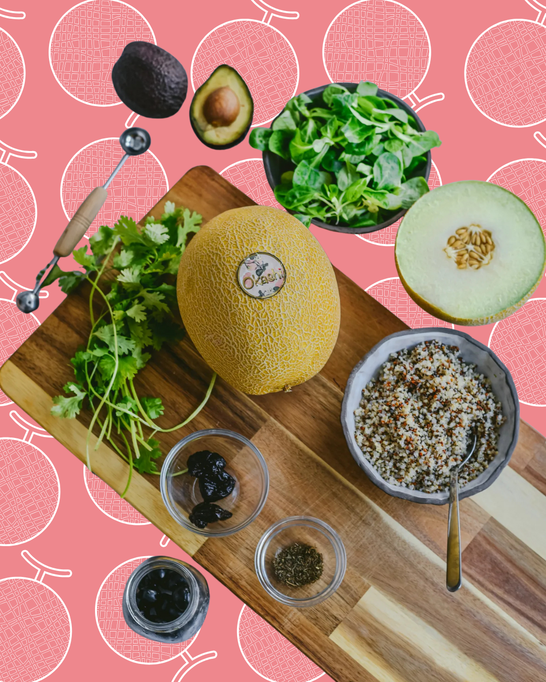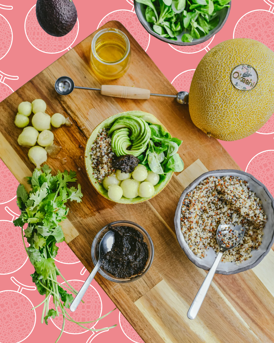 Sirve una base de canónigos y añade por encima la quinoa utilizando la cáscara del melón Okashi como bowl natural. Añade un poco de tapenade, el aguacate y el melón troceado. Aliña con un poco de aceite de oliva antes de comer.