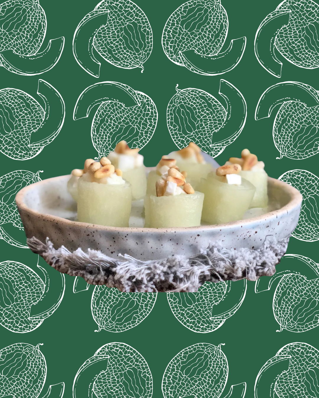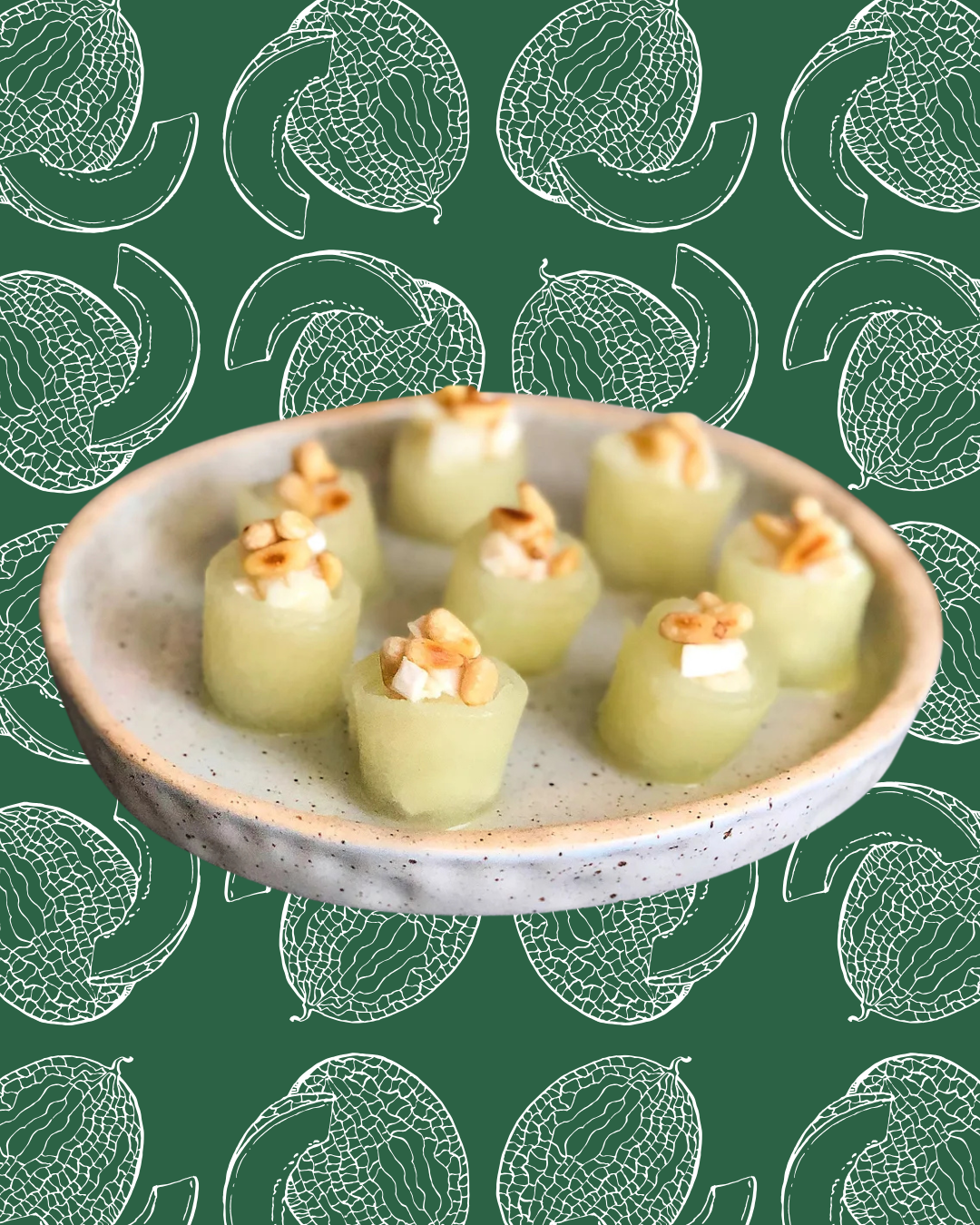 Montamos los canapés enrollando las láminas de melón, rellenamos con el melón y el queso y deporamos con los piñones tostados