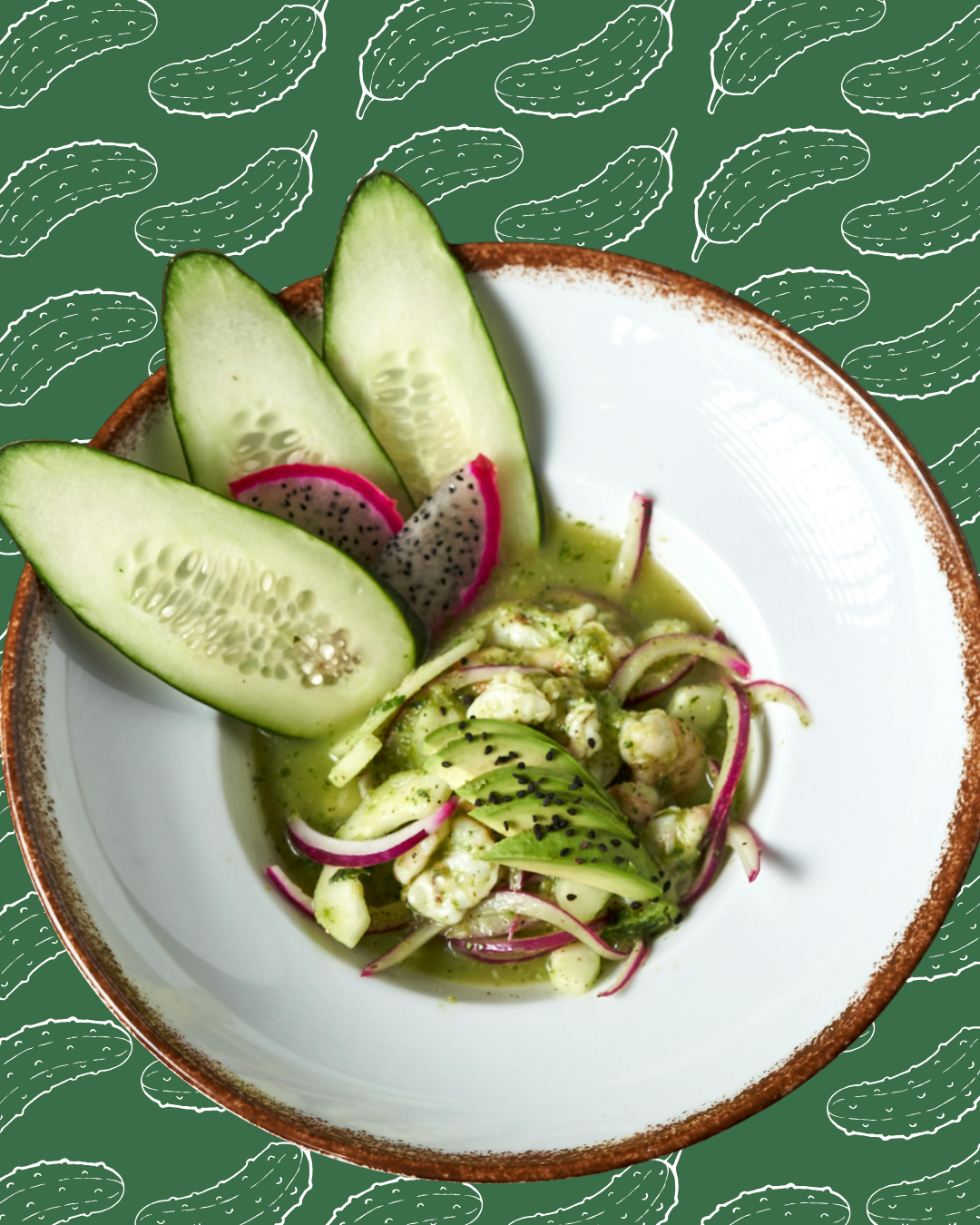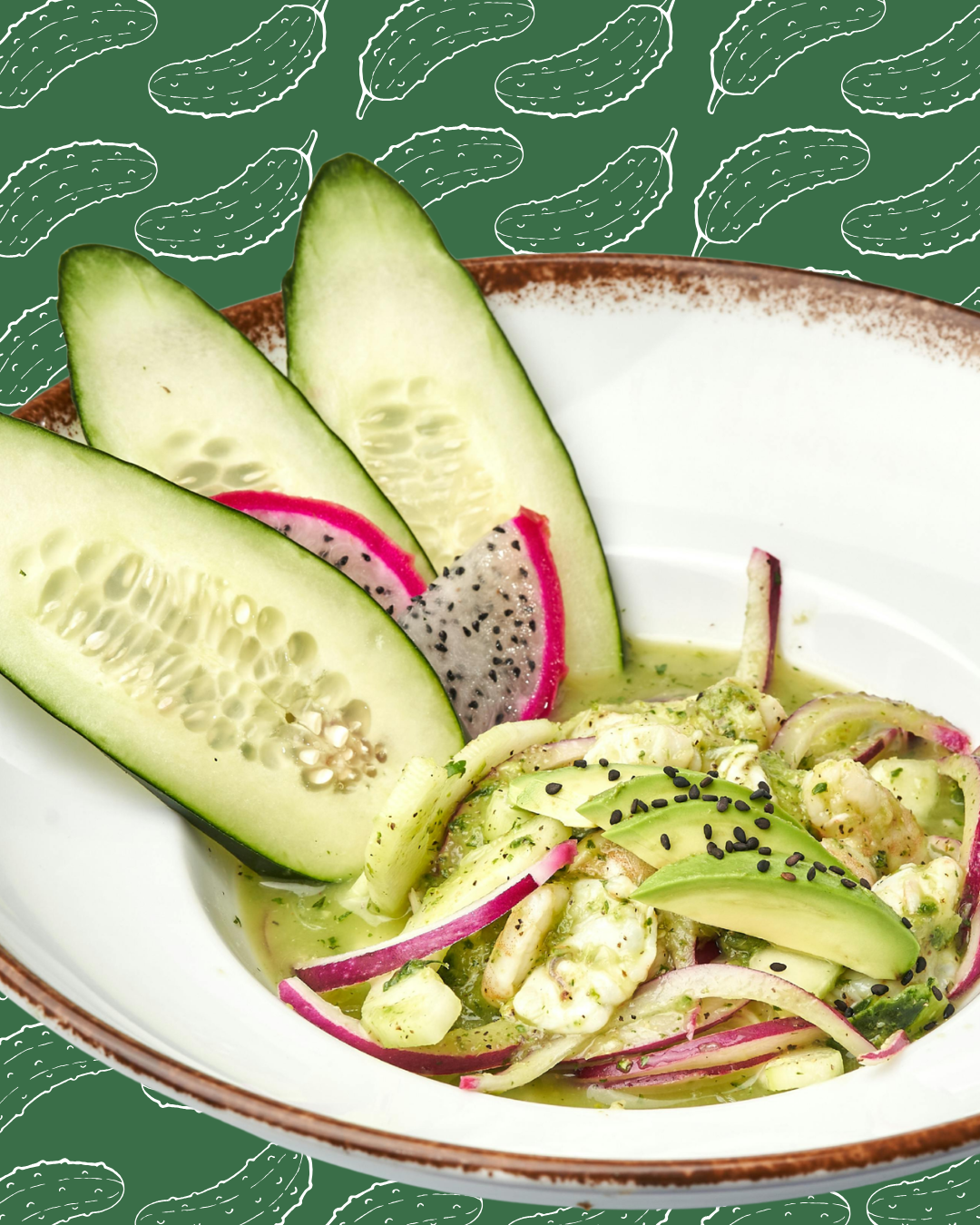 Sirve en un cuenco hondo, coloca las láminas de aguacate por encima y espolvorea semillas de sésamo negro. Decora con tiras largas de pepino y, si deseas, con rodajas de pitahaya para un toque exótico.