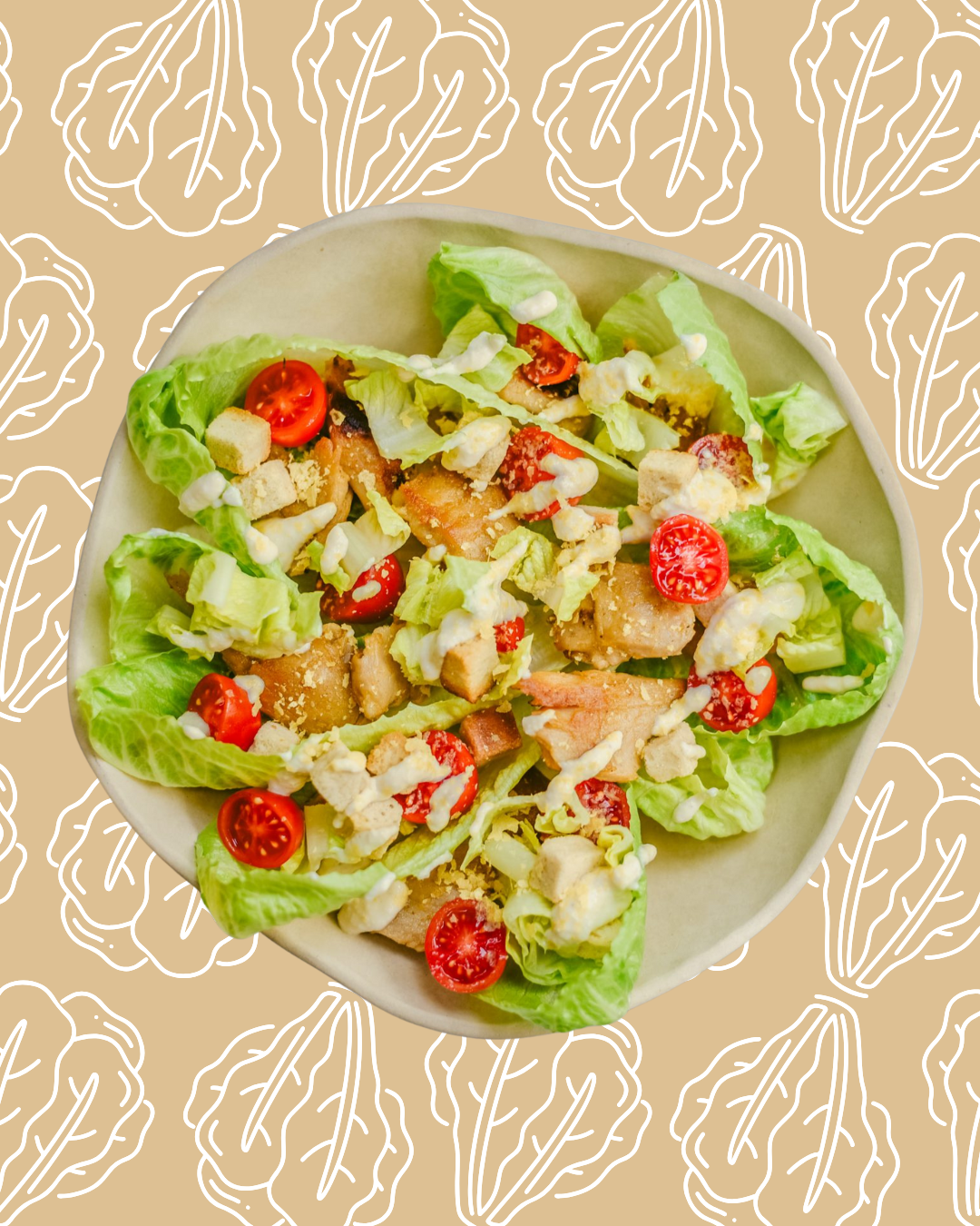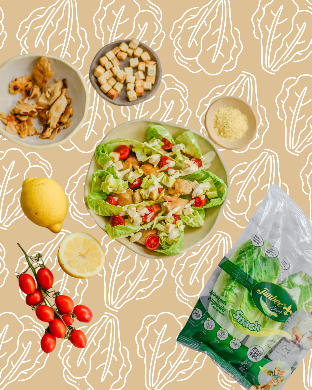 Sirve la ensalada con hojas de lechuga Jimbee Snack, tomates cherry a la mitad, picatostes de pan, el Heura (proteína vegetal) o pollo a la plancha y la salsa César al gusto.