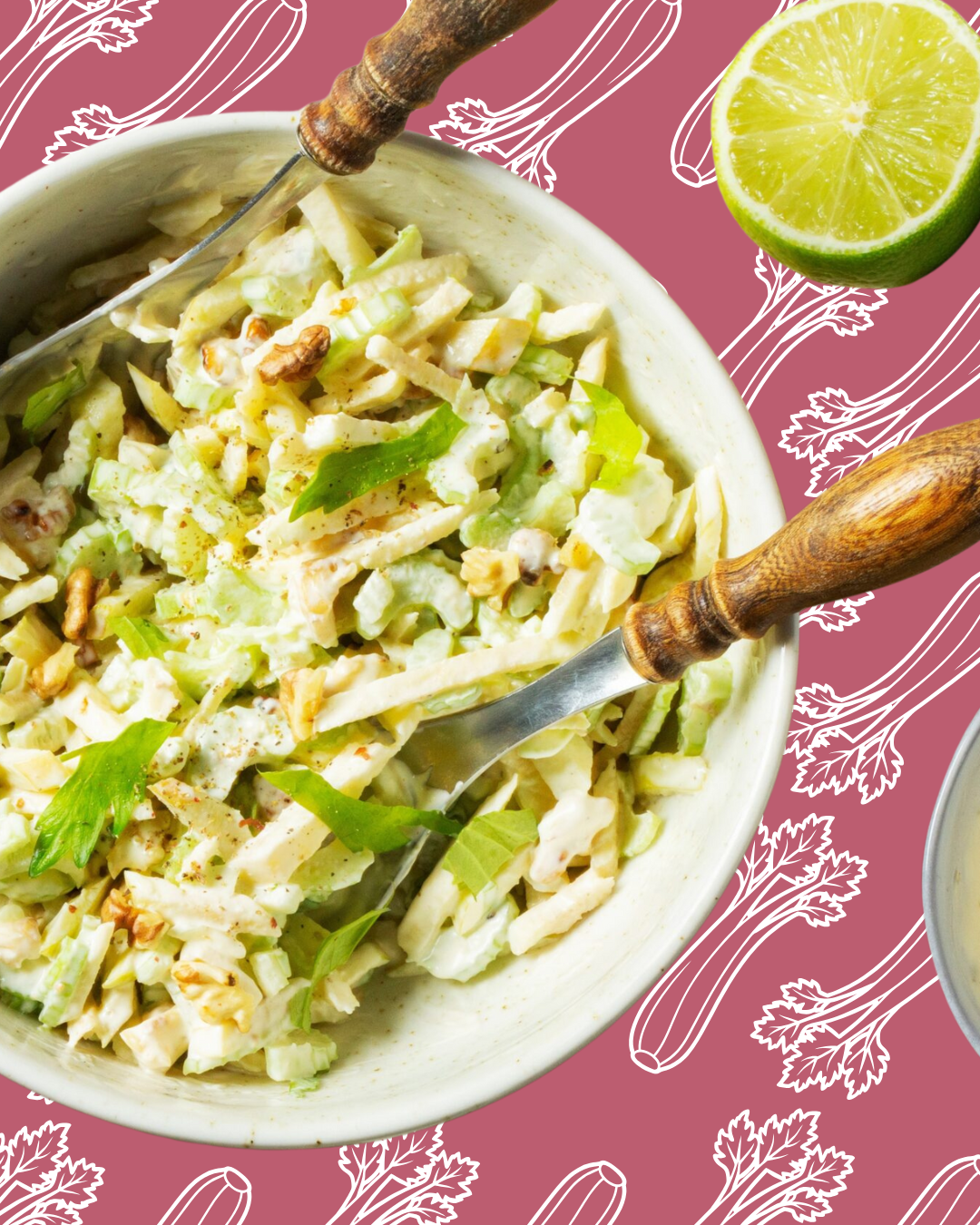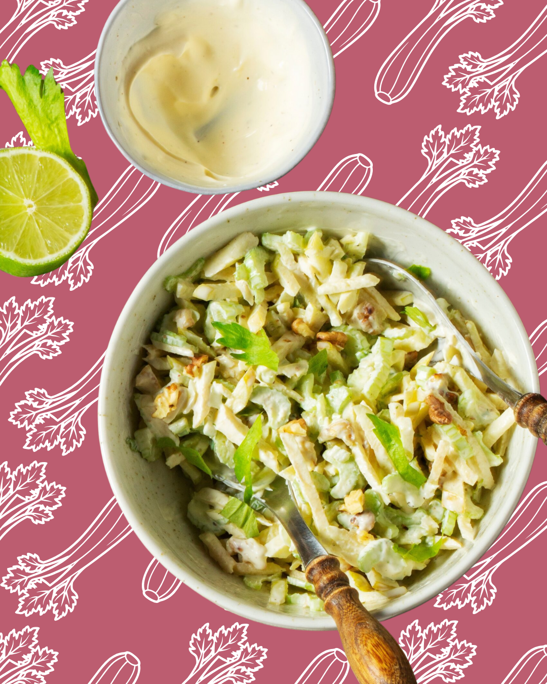 En un bol, mezcla el apio, la manzana y los frutos secos.
