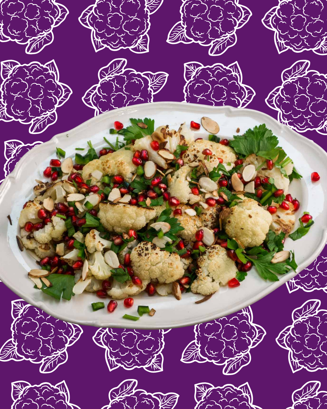 Ensalada de Coliflor Tostada, Granada, Perejil y Almendras