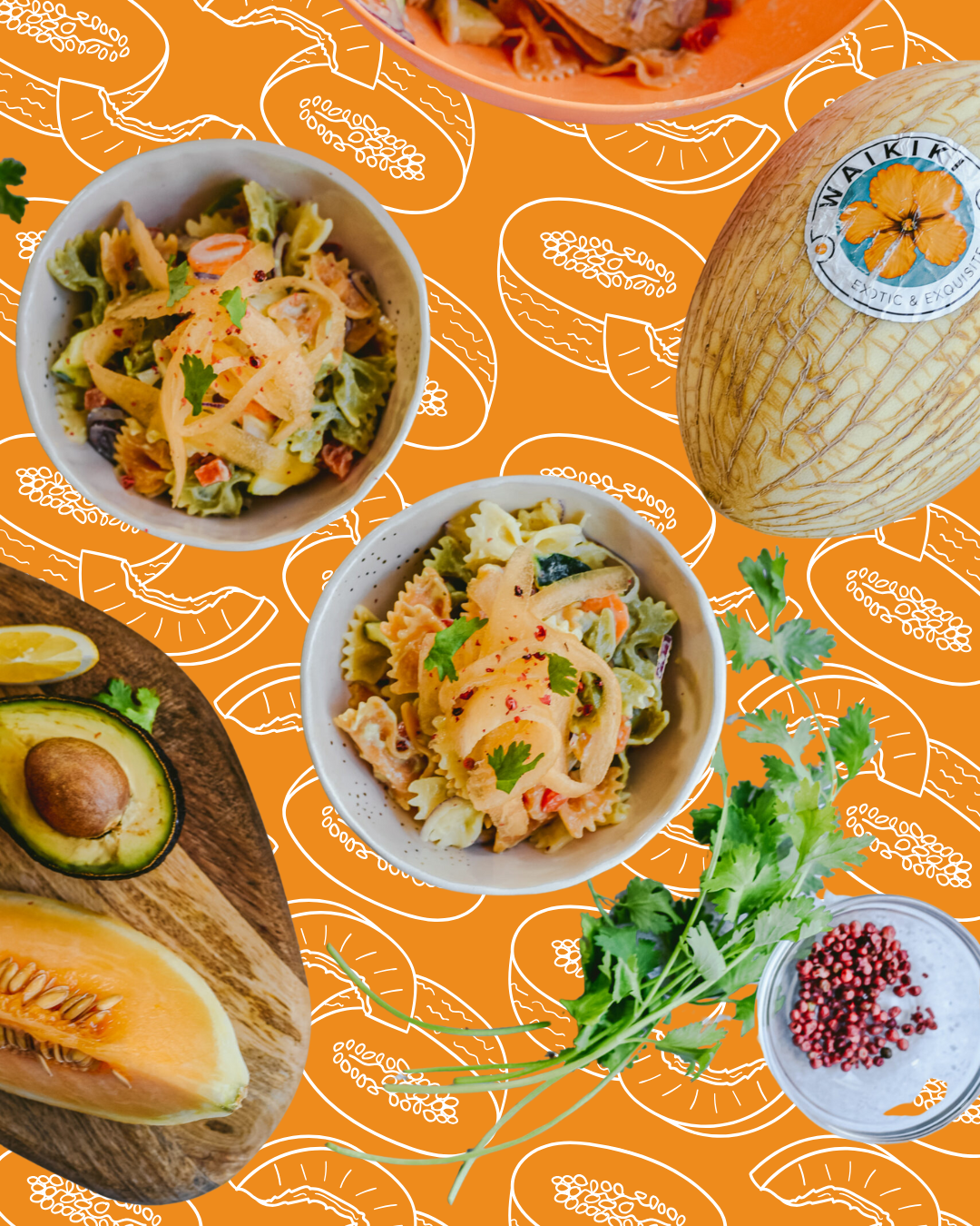 Ensalada de pasta con salsa de aguacate y noodles de melón Waikiki