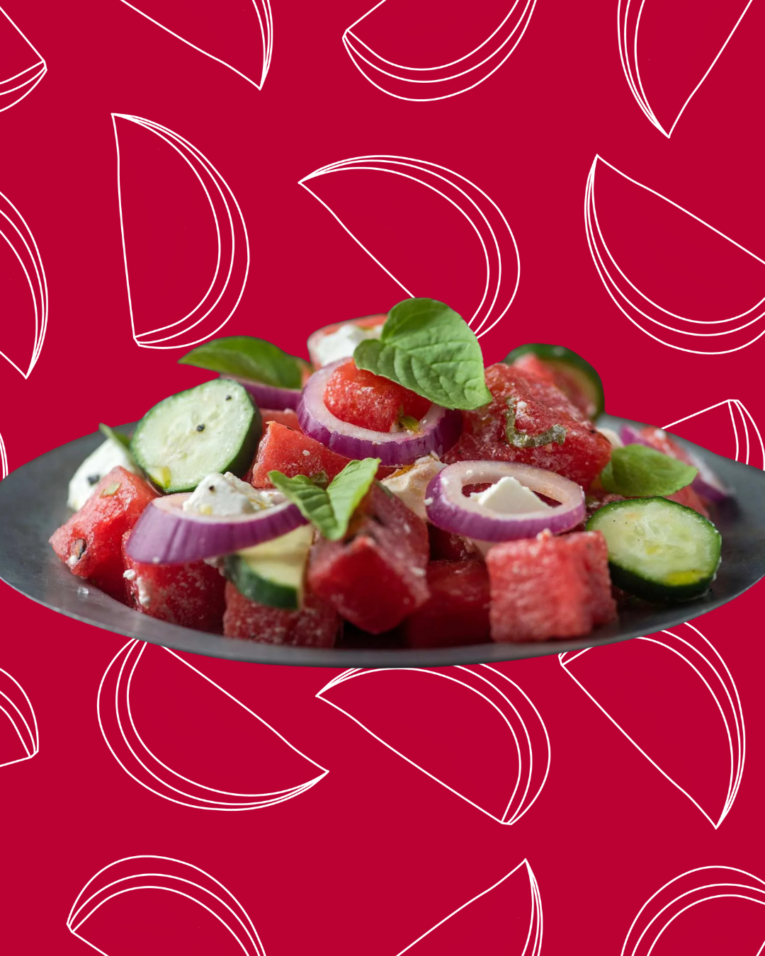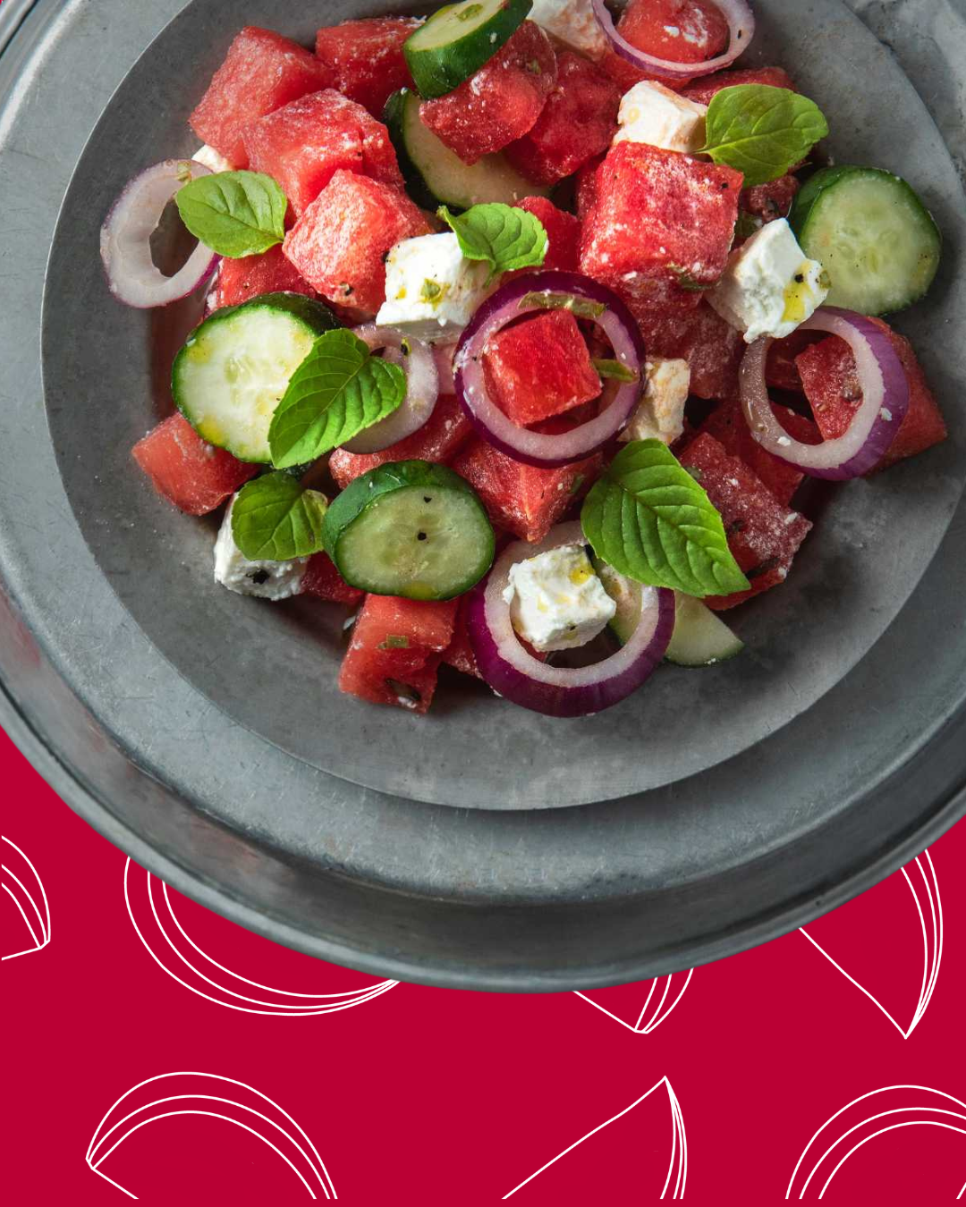 - Cortamos la sandía en cuadraditos, los pepinos en rodajas y la cebolla roja en láminas finas.