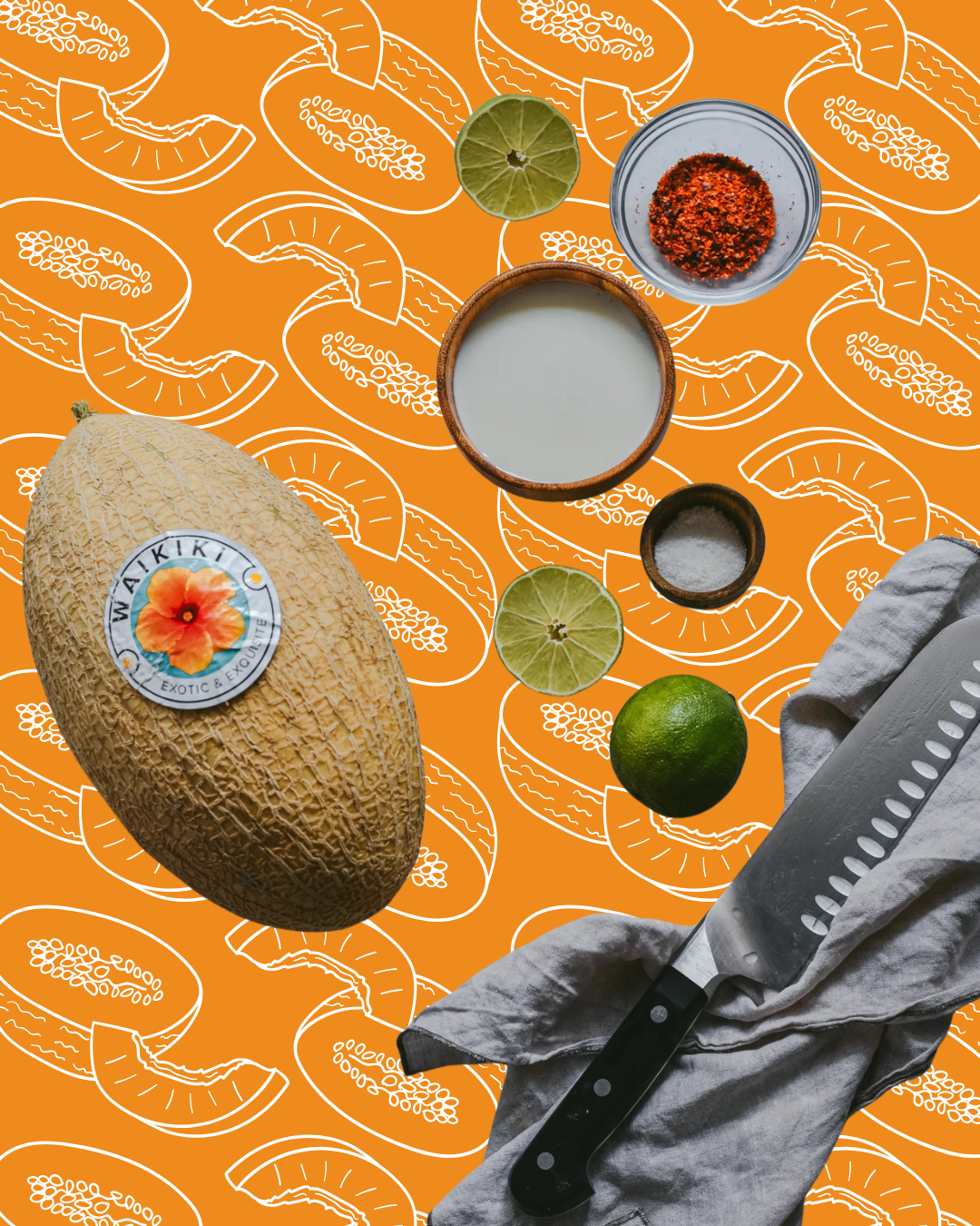 Corta el culo del melón Waikiki para tener una base. Pon el melón de pie e introduce el cuchillo desde la punta hacia la base y ve cortando tajadas (así será más fácil). Limpia las semillas y corta el melón en tiras, como si fueran patatas fritas.
