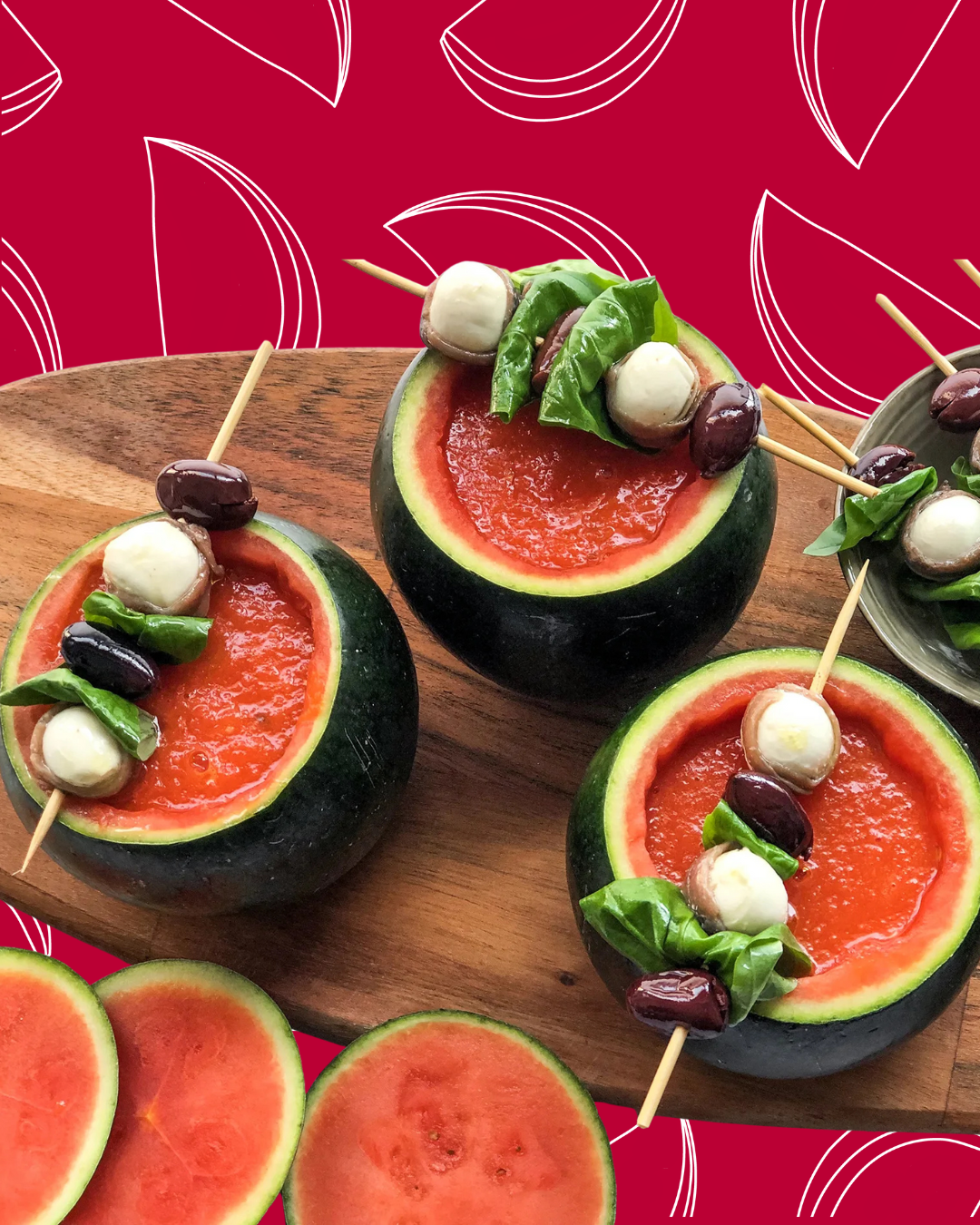 - Rellenar las sandías con el gazpacho, poner en cada sandía un par de brochetas y terminar añadiendo un chorrito de aceite de oliva en el gazpacho.