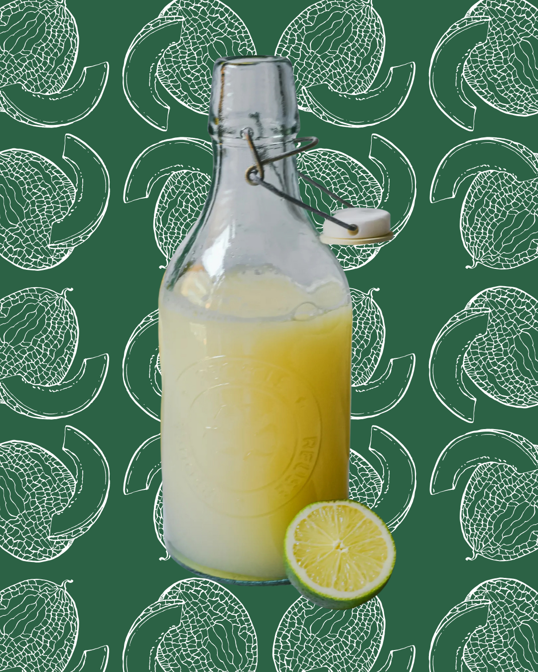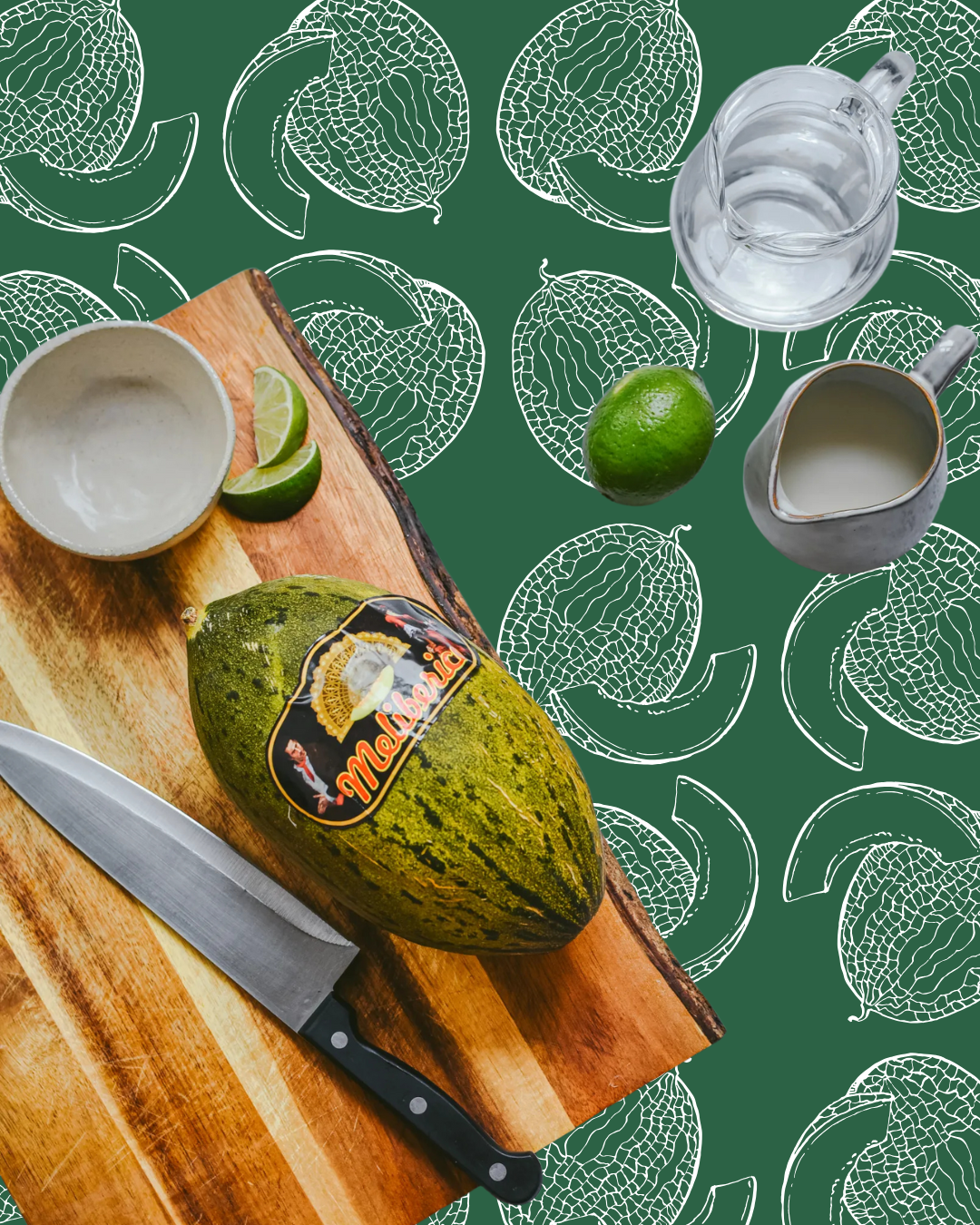 2. Corta el cuarto del melón en cubos y añádelo a tu vaso de batidora. Añade la bebida vegetal, las semillas, el agua y el zumo de lima. Tritura todo junto.