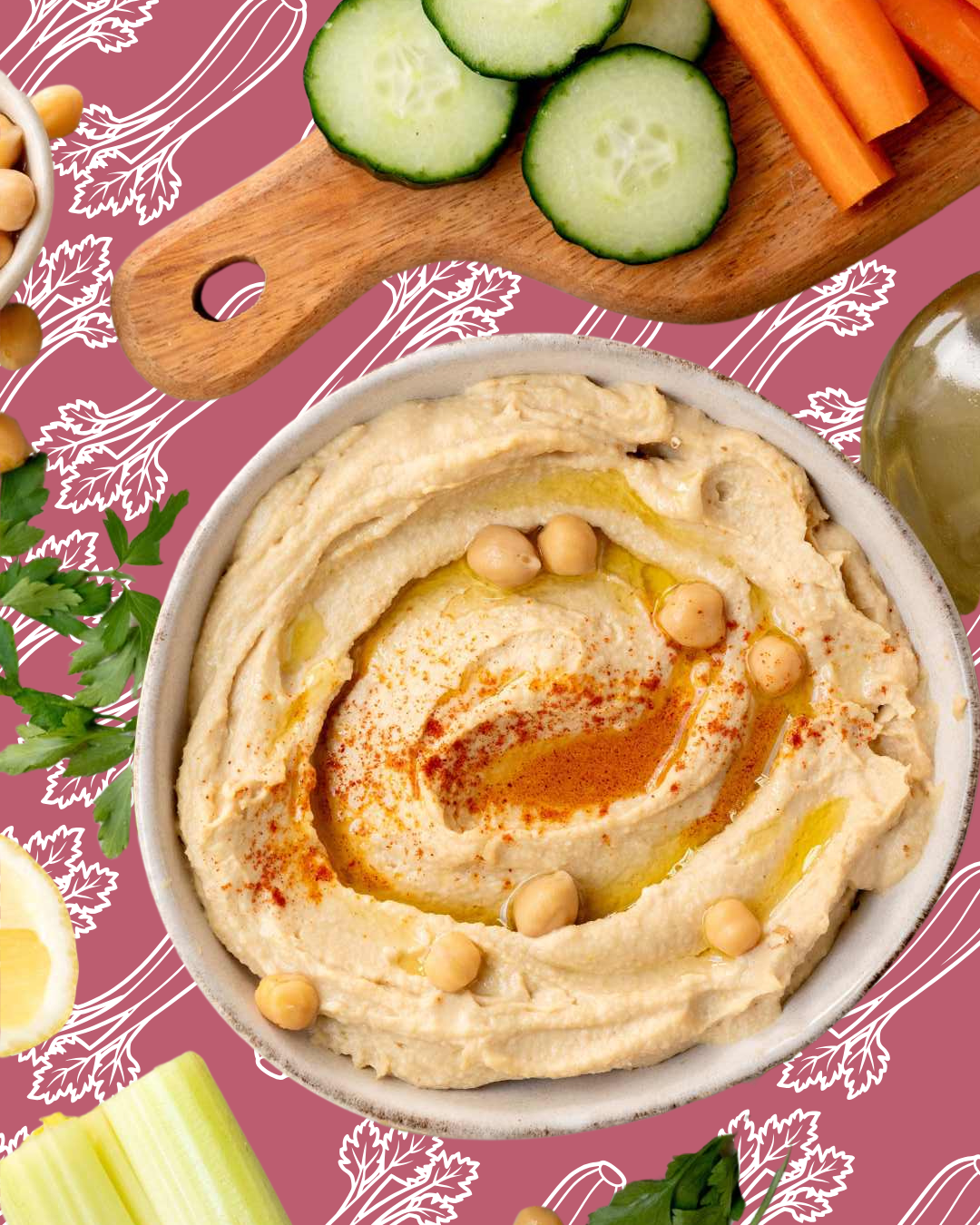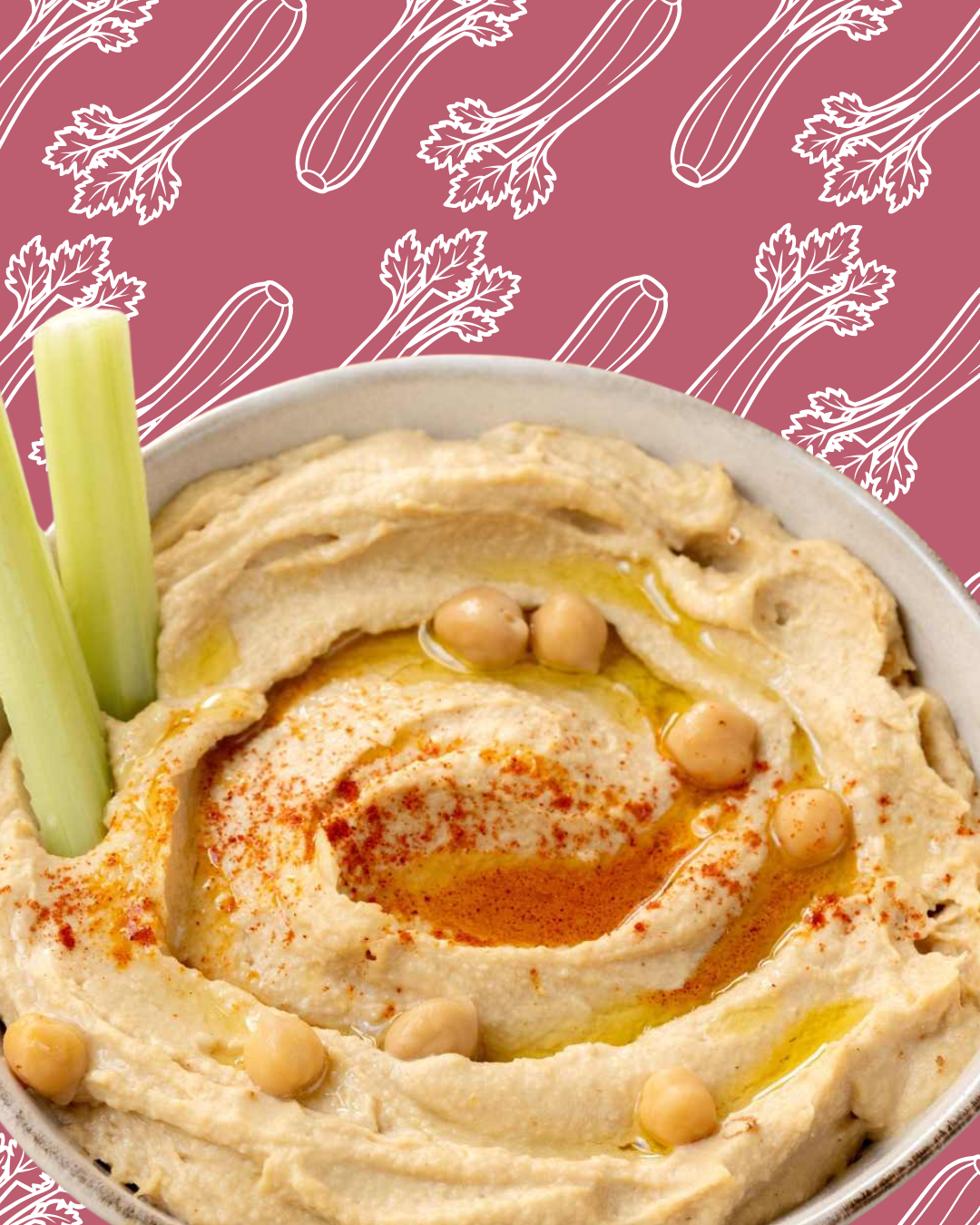 Acompaña el hummus con bastones de apio y pepino, ideales para mojar y disfrutar de un snack natural, fresco y saludable.