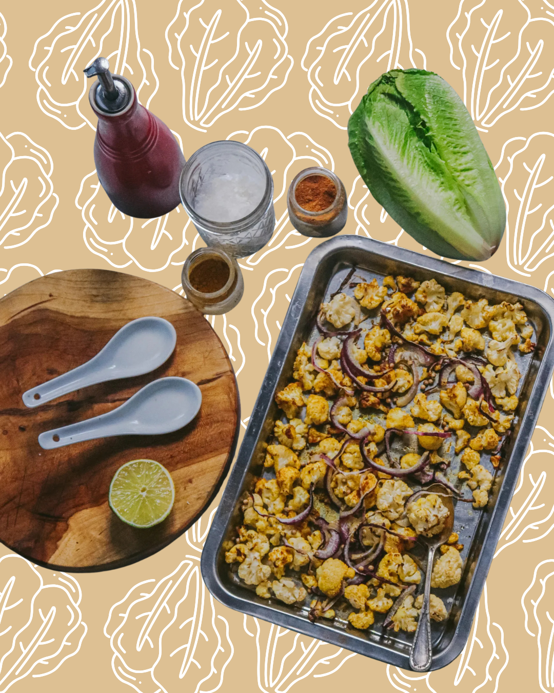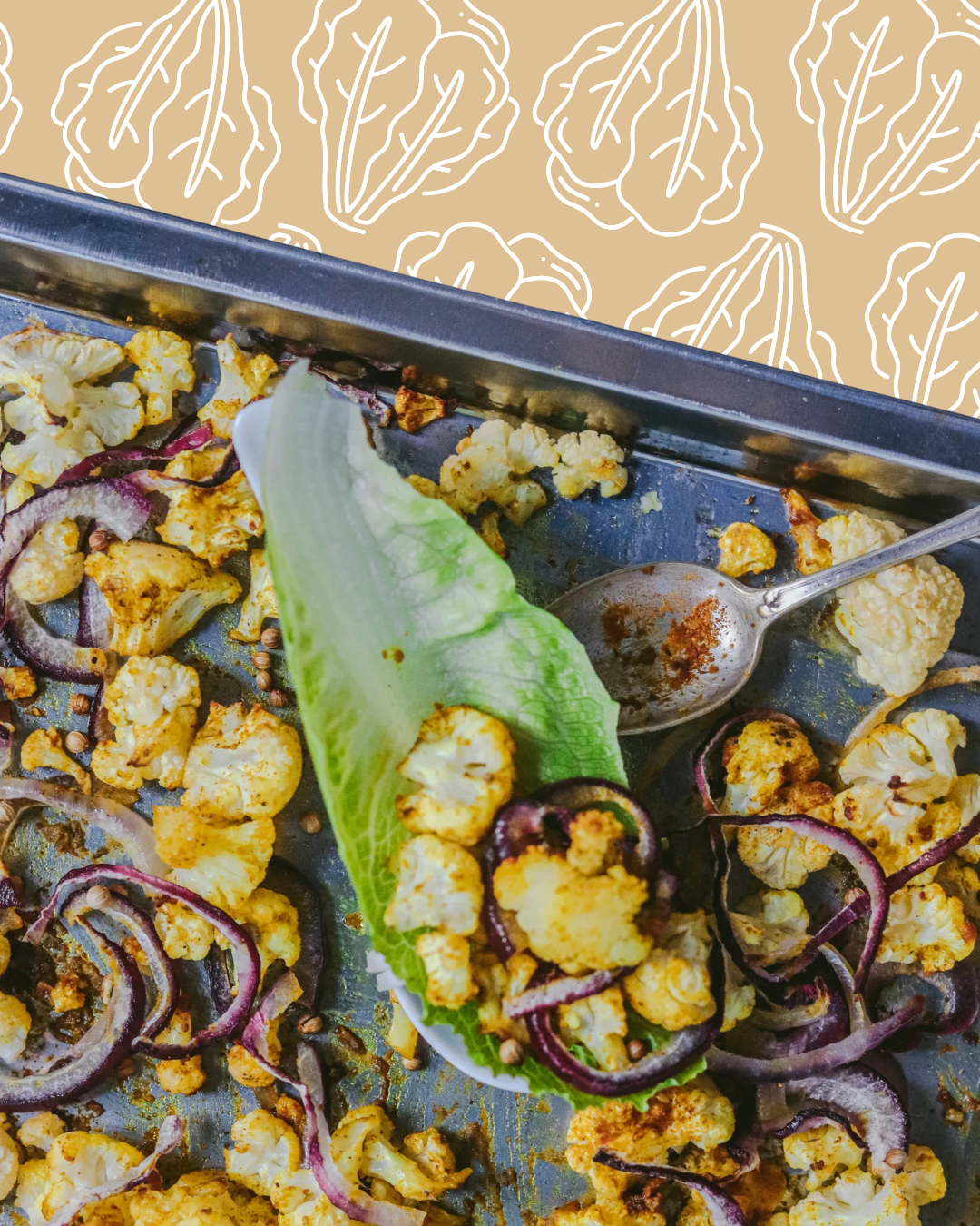 Precalienta el horno a 180º. Corta la coliflor en pequeñas flores. Lávala bien y extiéndela en una bandeja, añade el curry y la cúrcuma. Luego añade un chorrito de AOVE y sal al gusto. Mezcla todo bien.