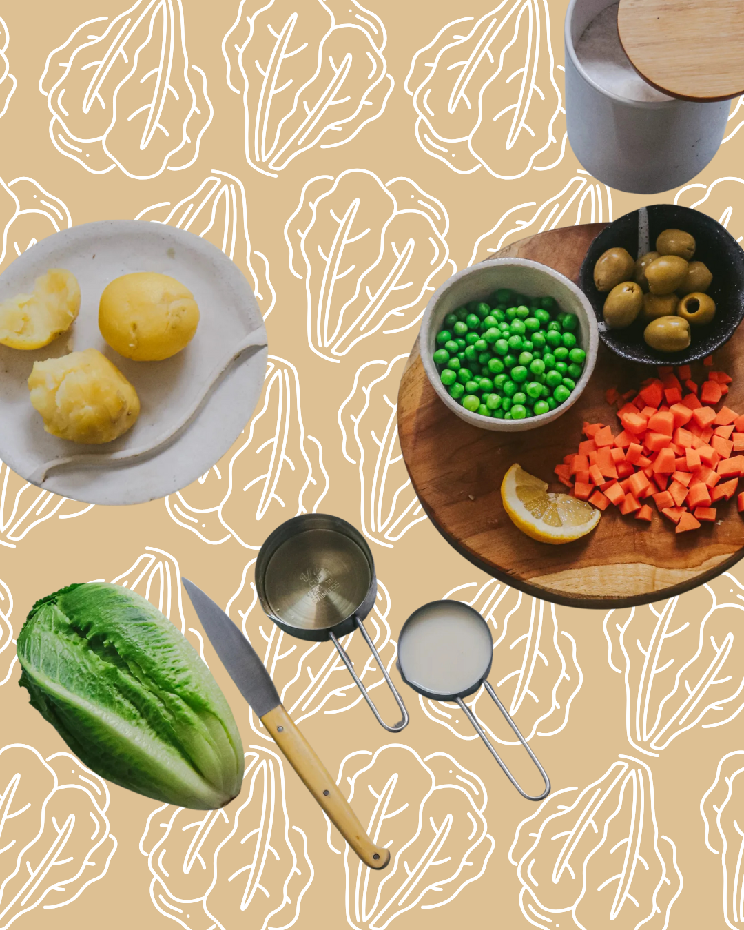 Cuando las patatas estén listas enfríalas con un poco de agua fría y quítales la piel. Luego deja que se enfríen y córtalas en cubo. Añádele a un bol junto con guisantes, zanahoria y aceitunas. Agrega un par de cucharadas de veganesa y combina.