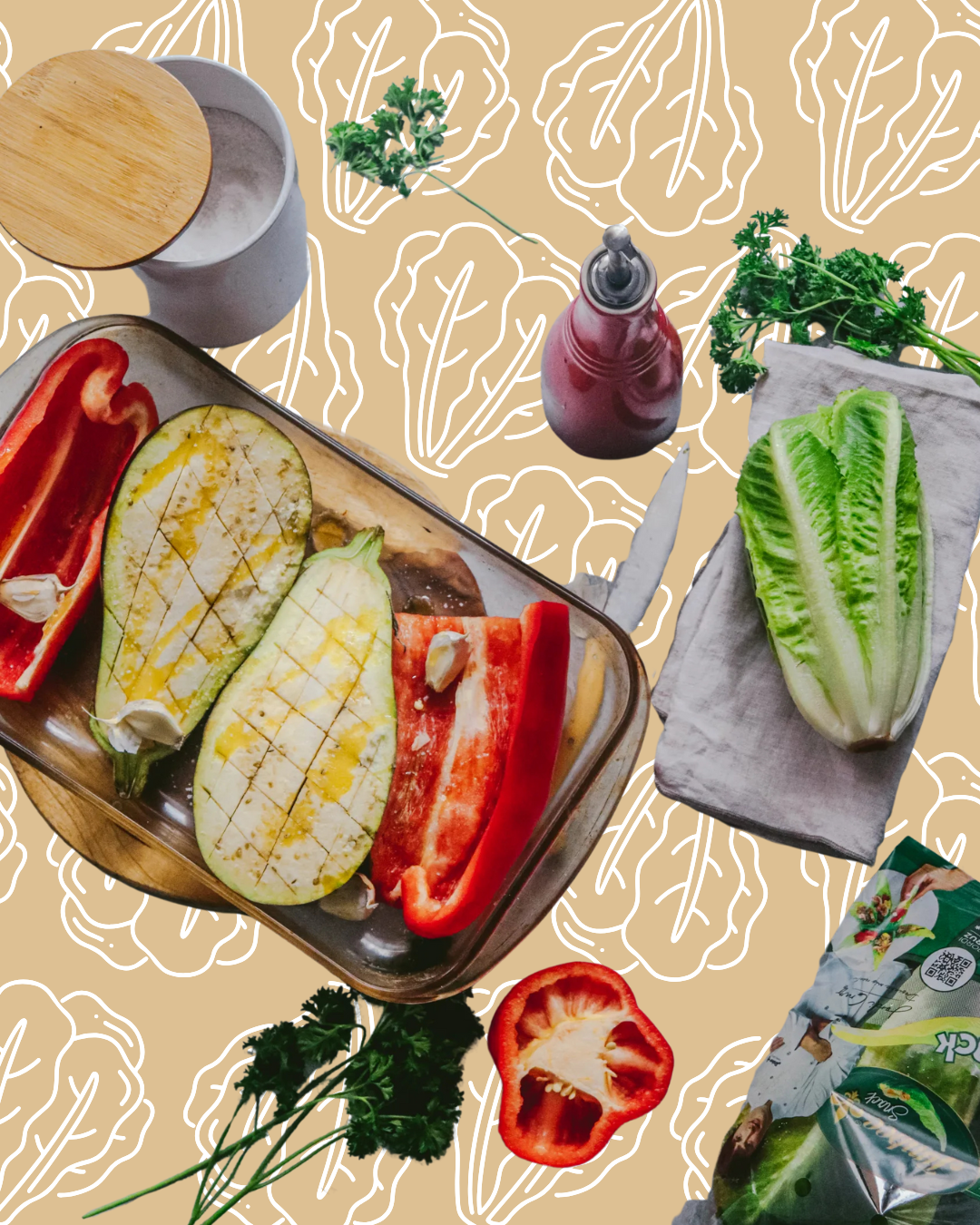 Corta la berenjena por la mitad y hazle cortes diagonales, ponla en una bandeja para horno. Corta también el pimiento por la mitad y quítale las semillas. Colocalo en la misma bandeja junto con unos ajos enteros.