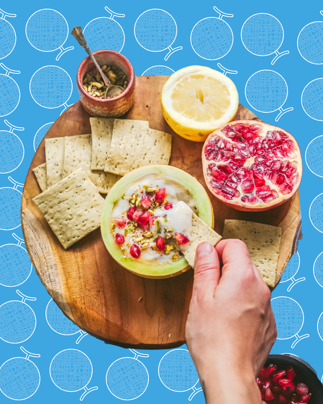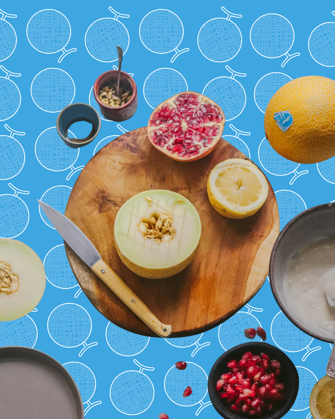 Coloca el labneh en el bol de melón, añade un poco de ralladura de limón, pis-tachos, granada y un chorrito de sirope.