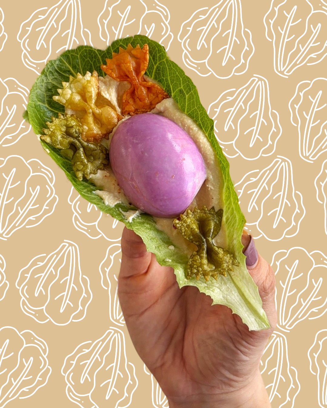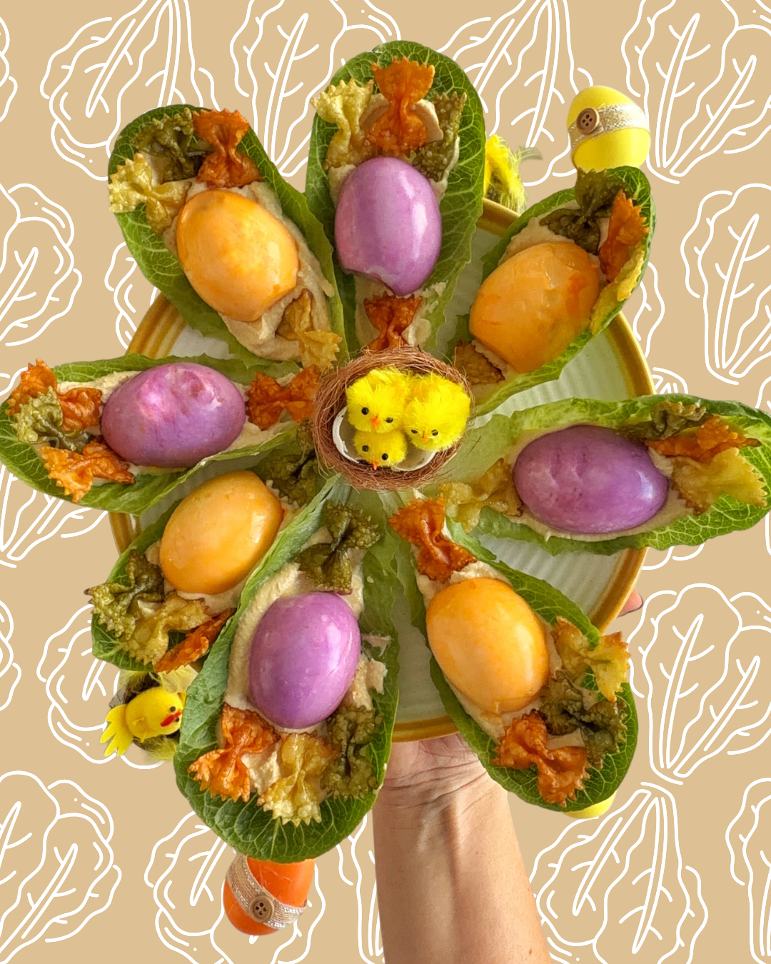 Para montar, coloca los lazos crujientes sobre el hummus formando un “nido” y añade medio huevo de color en el centro.