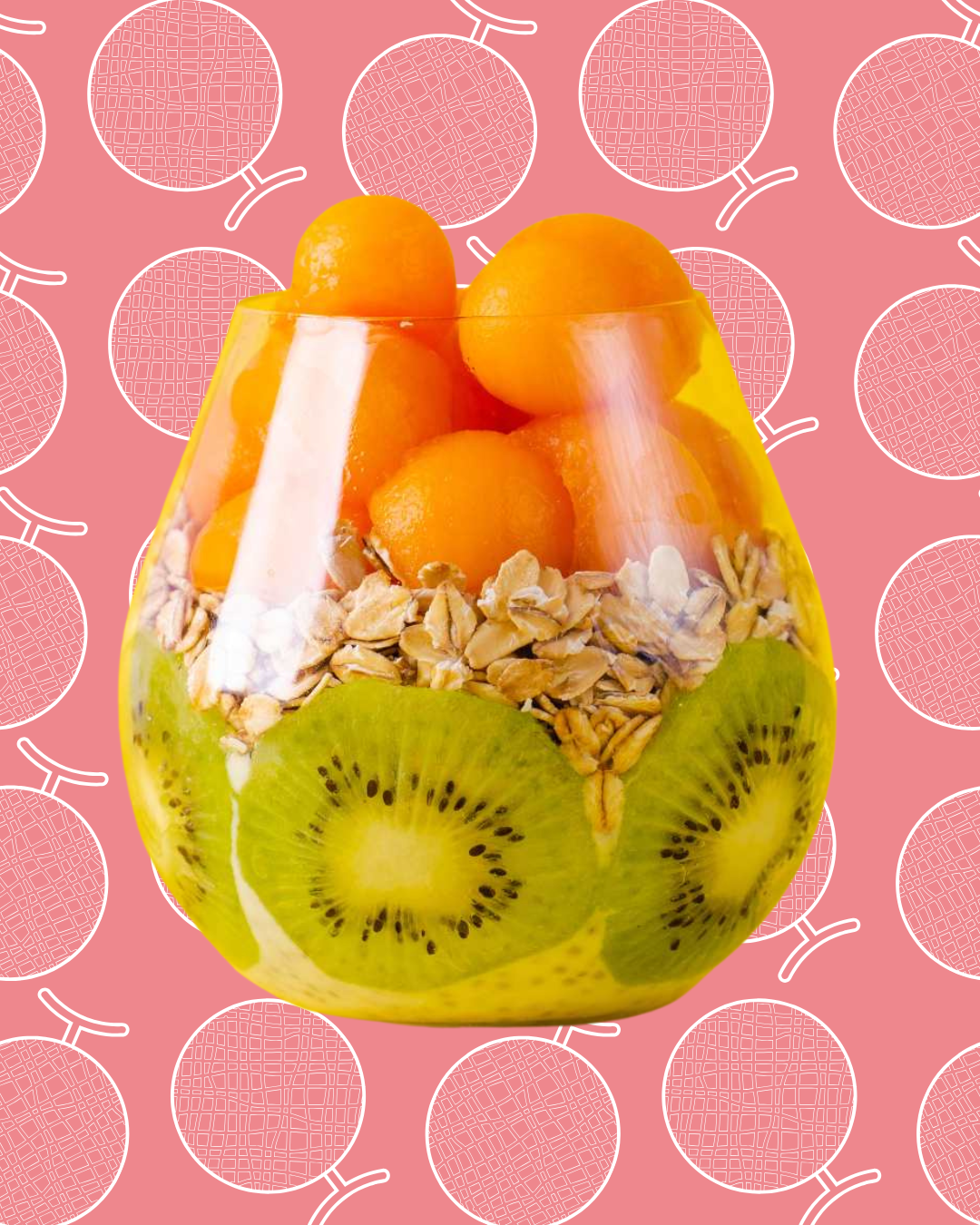 Añade una capa de avena, luego bolitas de melón y rodajas de kiwi.