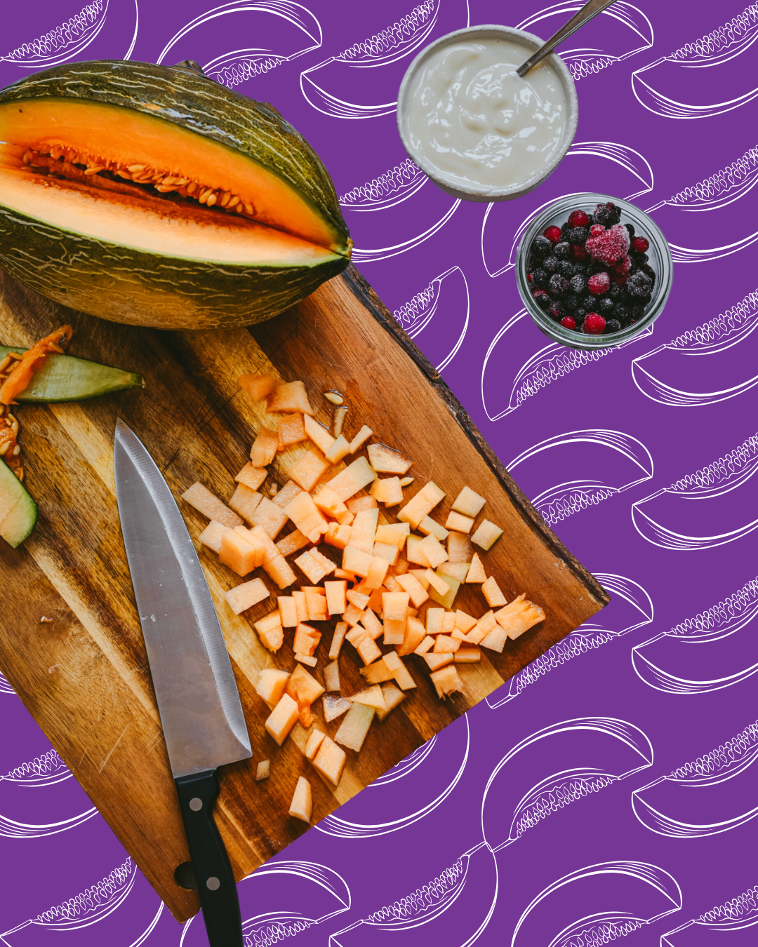 Corta el melón por la mitad, limpia las semillas. Pela la corteza y a continuación corta el melón en cubitos.