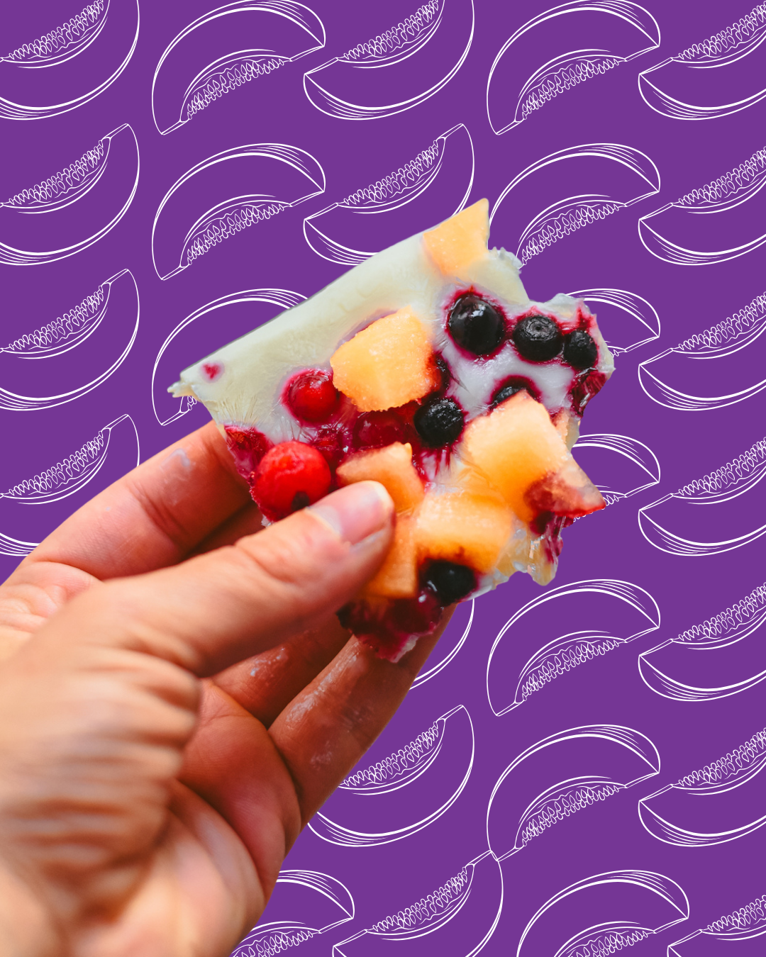 Forra una bandeja con papel de transparente o antiadherente y vierte el yogur. Extiéndelo bien y añade frutos rojos, melón y los frutos secos troceados.
