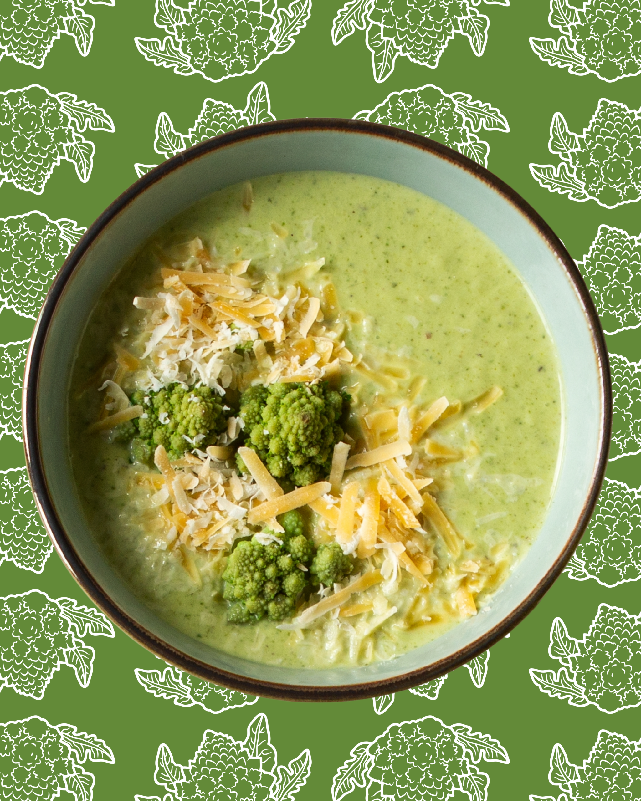 Incorpora la patata y el romanescu picado (reserva algunos ramilletes pequeños para decorar). Cubre con el caldo de verduras, sazona con sal y cocina durante unos 15–20 minutos, hasta que todo esté bien tierno.