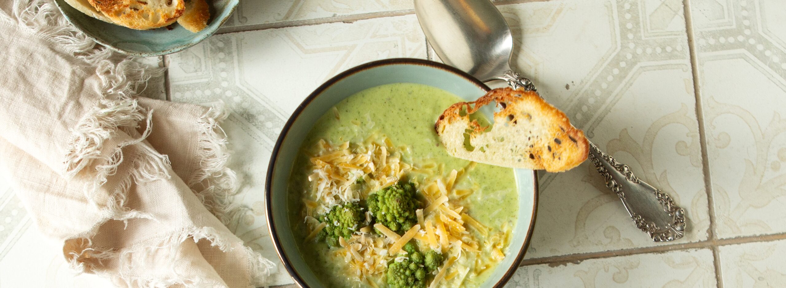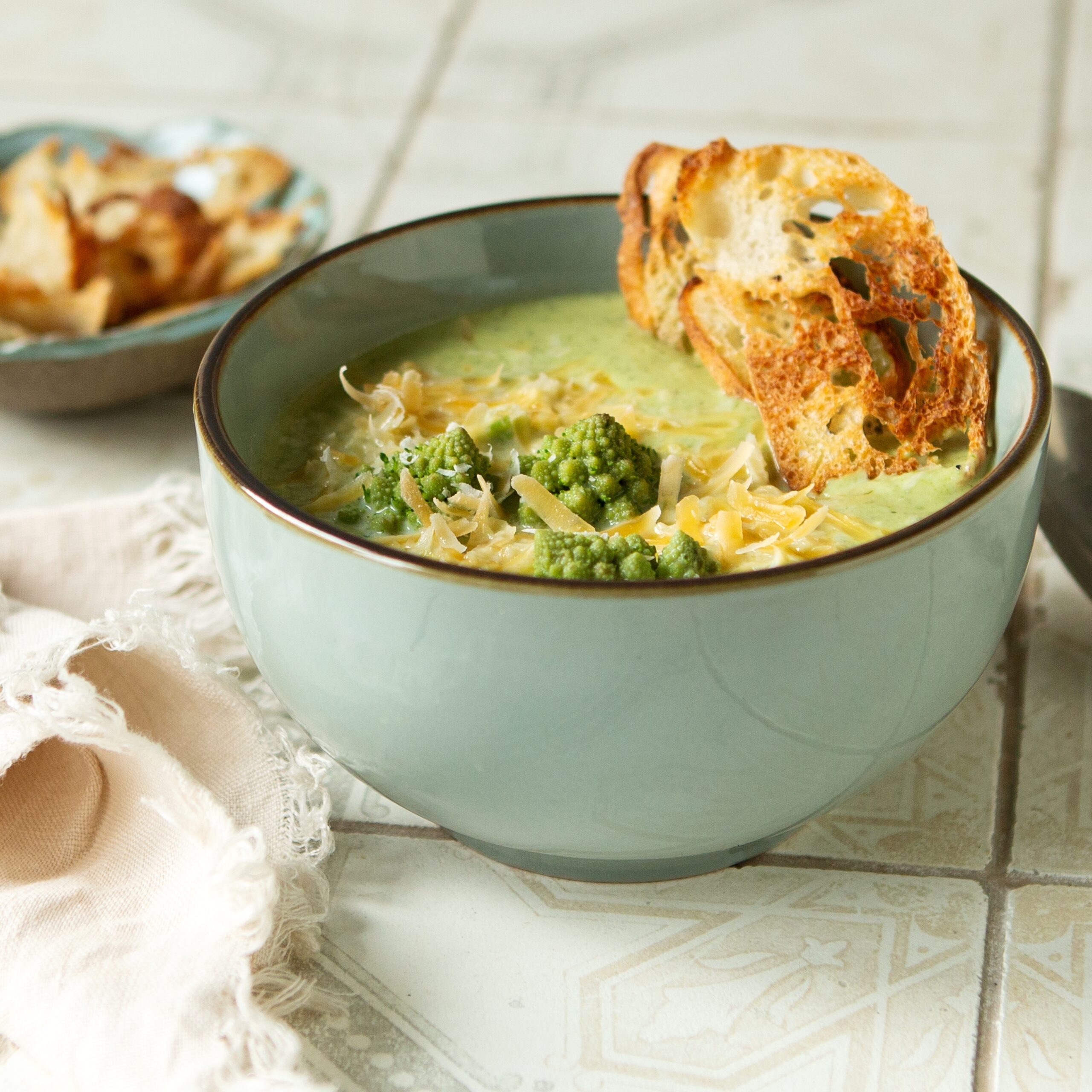Sirve la sopa caliente, coloca encima los ramilletes reservados, espolvorea el queso rallado y acompaña con las tostadas crujientes.