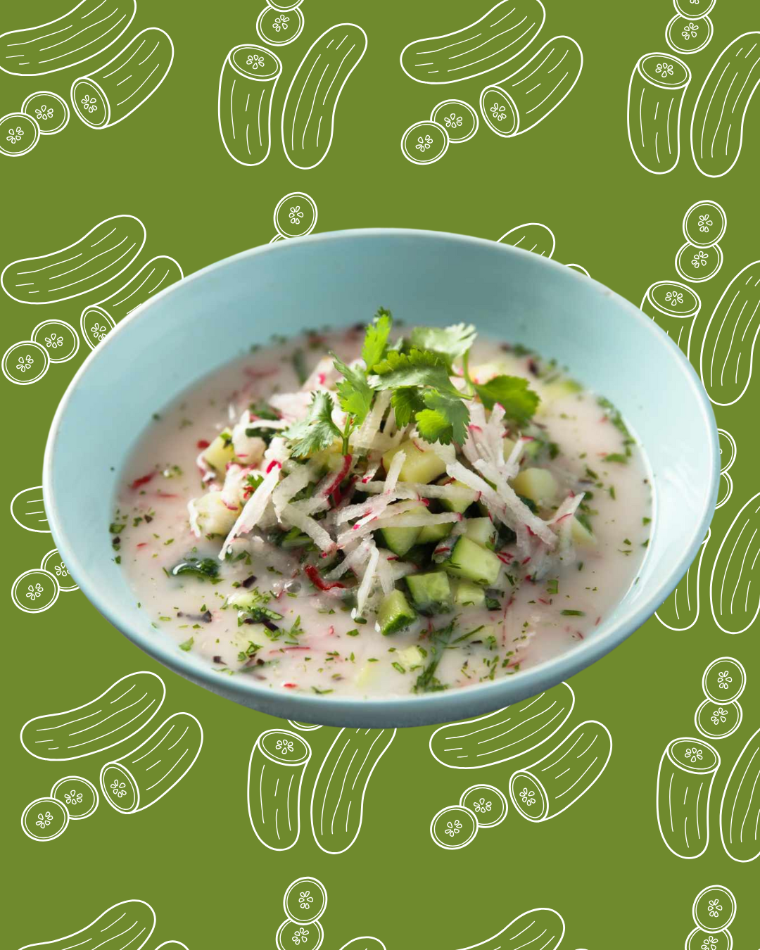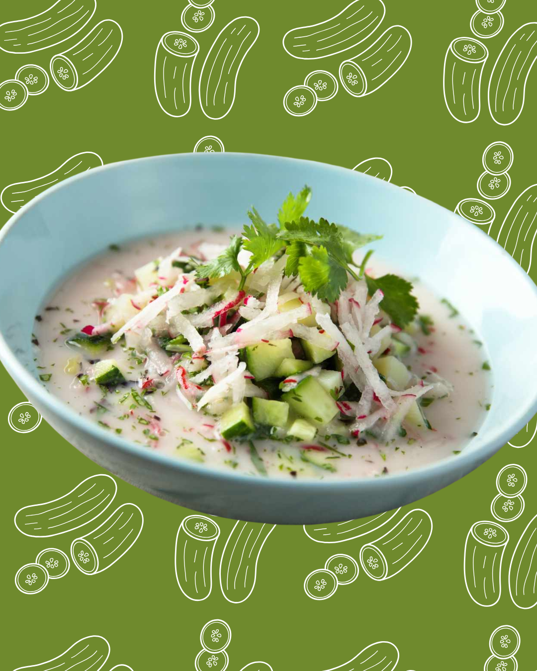 En una licuadora o procesador de alimentos, agrega los pepinos, los rábanos, el diente de ajo, el yogur griego, el agua fría, el aceite de oliva y el jugo de limón. Licúa hasta obtener una mezcla suave y cremosa.