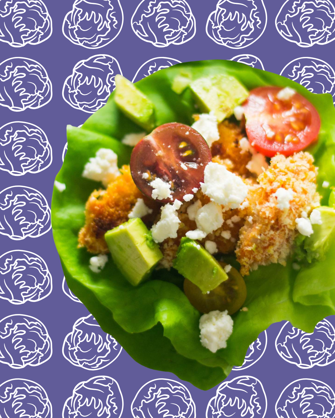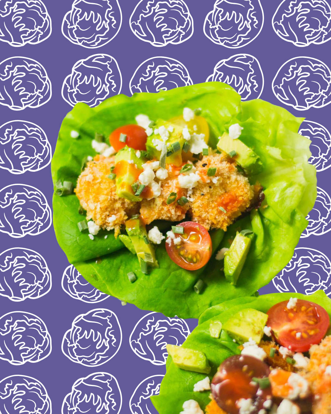 Coloca una hoja de lechuga en un plato y, sobre ella, pon una porción de pollo buffalo crujiente.