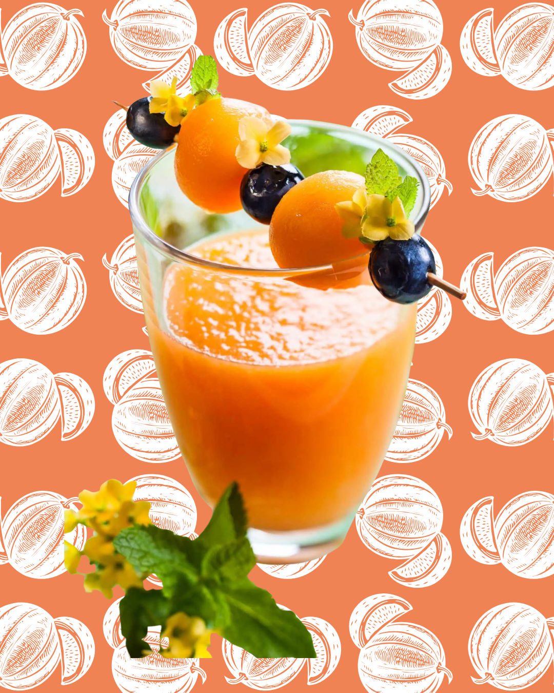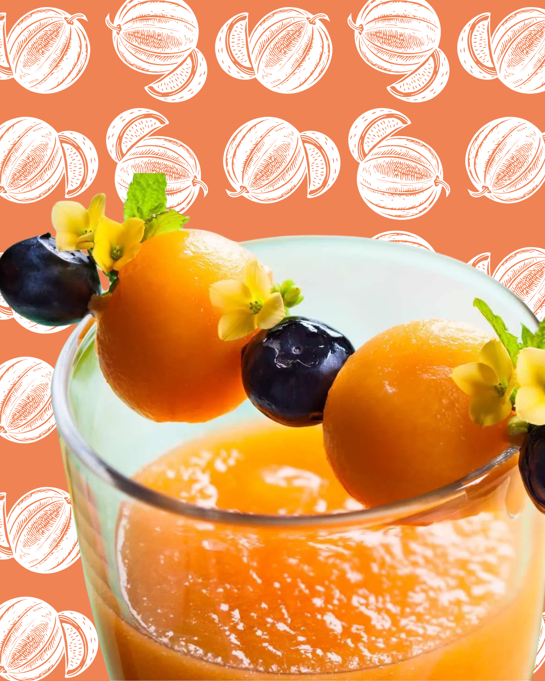 Para decorar, coloca un palillo con 3 arándonos, flores comestibles y dos bolas de melón. ¡A tus invitados les encantará!